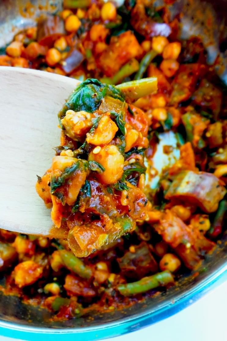 3. Add the chickpeas, green beans, herbs, spices and tomato paste.