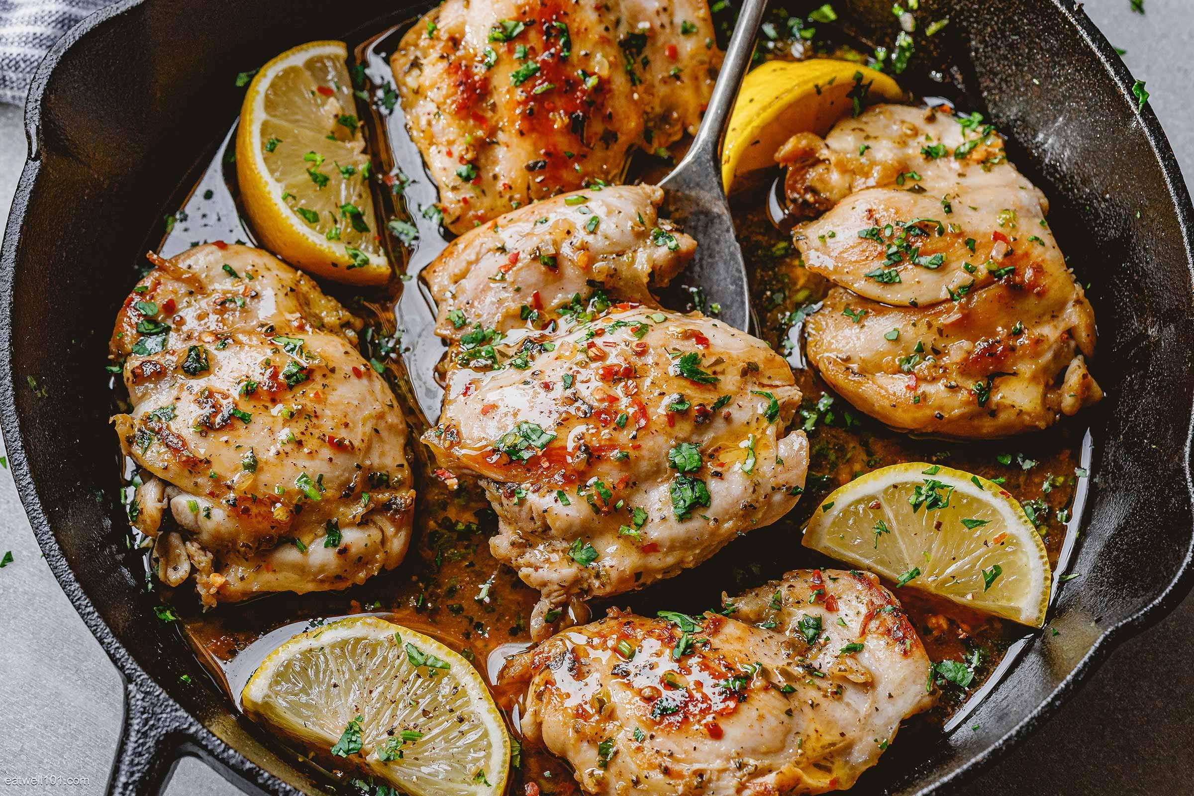 4. Once chicken thighs are cooked, remove them from the oven and garnish them with fresh parsley and lemon wedges. Serve the lemon garlic baked chicken thighs over steamed rice or cauliflower rice, and don’t forget to drizzle with the pan juices. Enjoy!